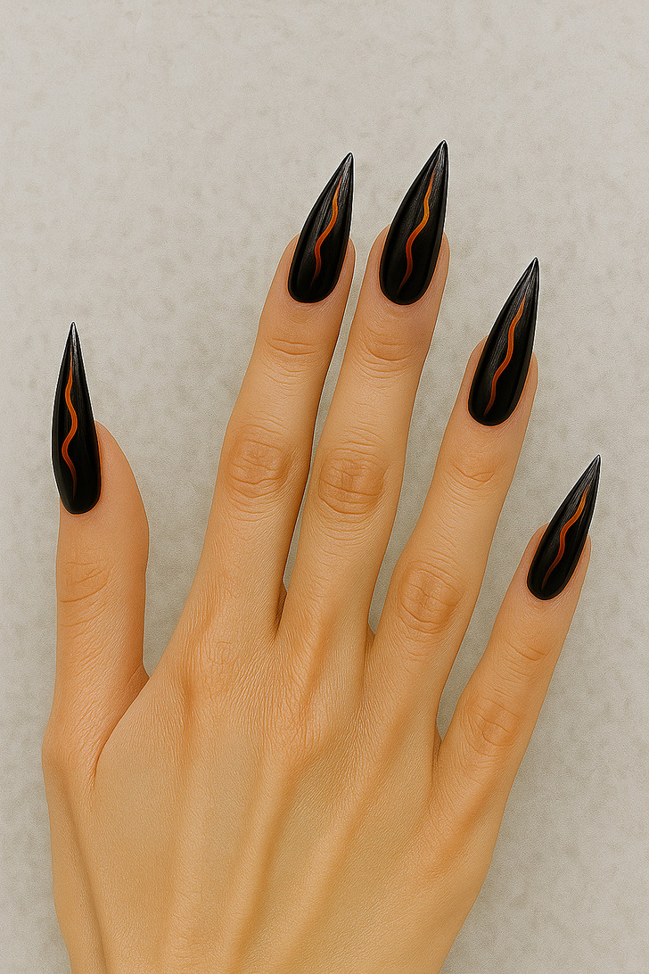 Chaque fois que tu imagines une sorcière, il est probable que ses ongles soient noirs, pointus et longs, tout comme ces escarpins effrayants. Pour un peu plus de frisson, tu peux peindre une fine flamme rouge sur tes griffes noires ou les transformer en design en marbre sanglant afin d’ajouter un peu plus de profondeur à ta tenue macabre.