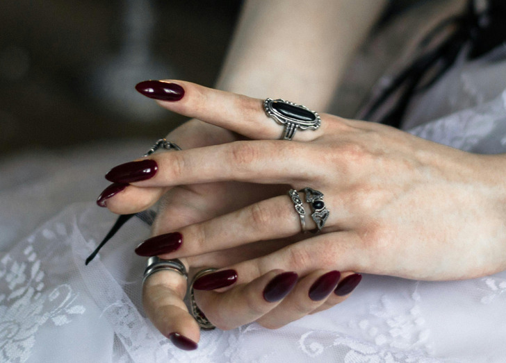 Si tu recherches des tons sombres, gothiques et vampiriques tout en restant minimaliste, une couche de cerise noire est parfaite. Elle est intemporelle et semble d’une élégance sans effort, non seulement pour Halloween, mais aussi pour la saison automnale. Tu peux ajouter de la longueur à tes ongles pour un look plus dramatique, ou les garder courts et arrondis si tu n’es pas habituée aux ongles longs.