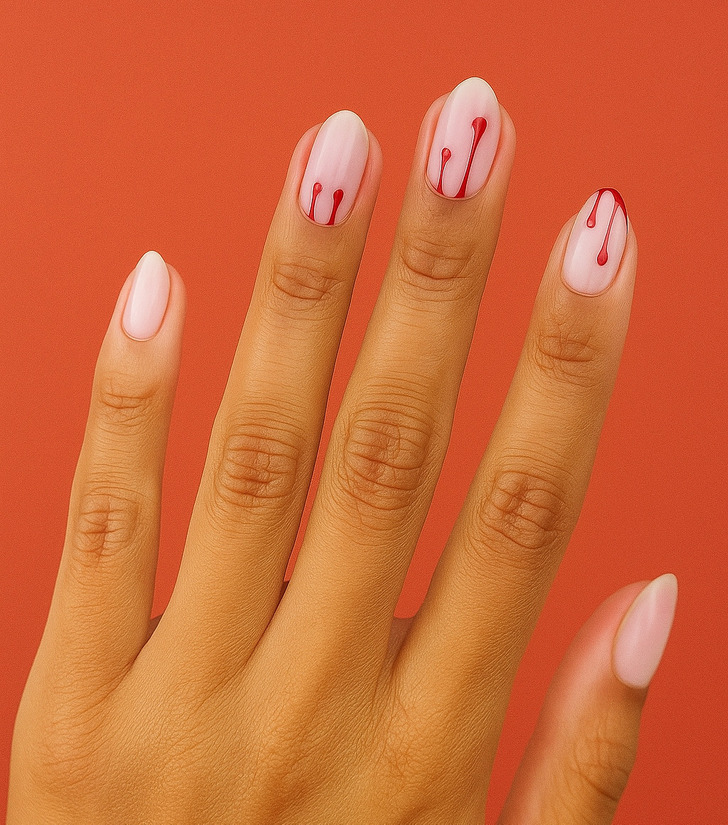Alors que la plupart des gens aiment voir les choses en grand pour Halloween, tu peux opter pour un design sanglant et dégoulinant minimaliste, mais élégant, à associer avec n’importe quel costume de ton choix, que tu sois déguisée en zombie, en infirmière ou en vampire. C’est parfait pour ceux qui ont déjà une manucure neutre, car tout ce que tu as à faire est de laisser couler un peu de rouge pour créer l’effet.