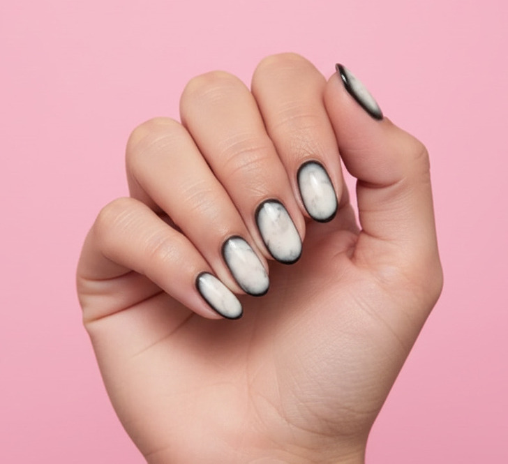 Cette manucure chic conviendra parfaitement à un costume de fantôme, sirène ou loup-garou. Elle évoque une journée brumeuse, tout en peignant quelques sombres orées pour la rendre audacieuse pour la saison. Elle rappelle également des volutes de fumée noire sur une toile blanche.