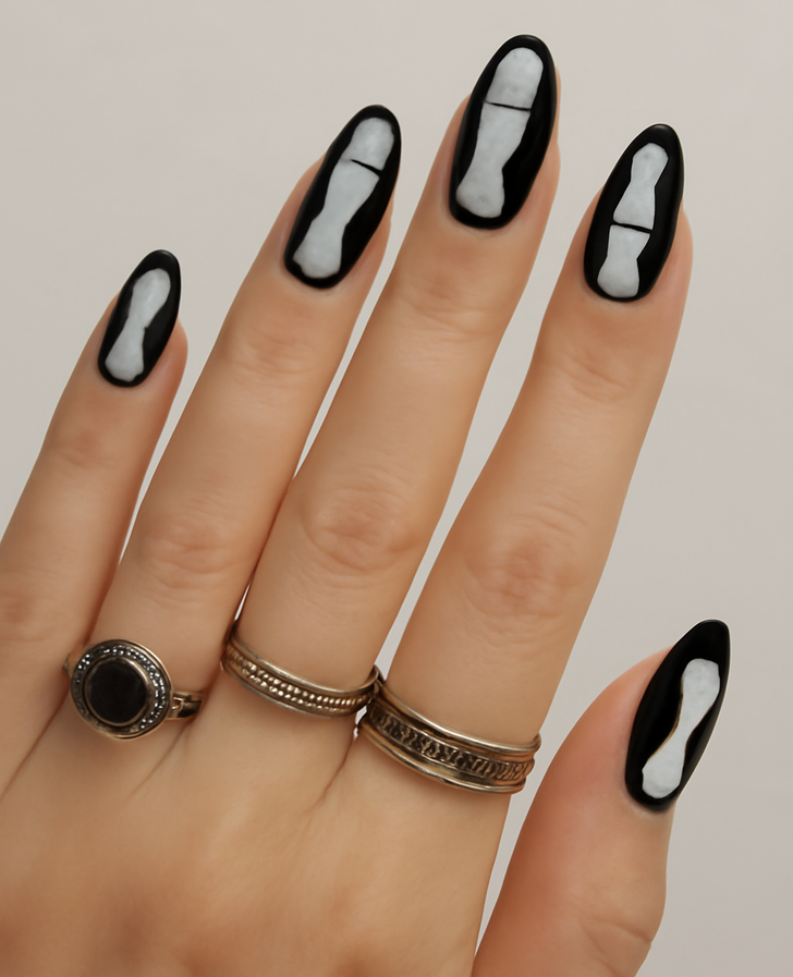 Si tu arbores un costume de squelette, quelle meilleure idée de manucure pour les compléter que ces ongles passent qui passent au rayon X les extrémités de tes doigts ! C’est original et cela s’harmonisera bien avec n’importe quel autre costume sombre que tu as en tête.
