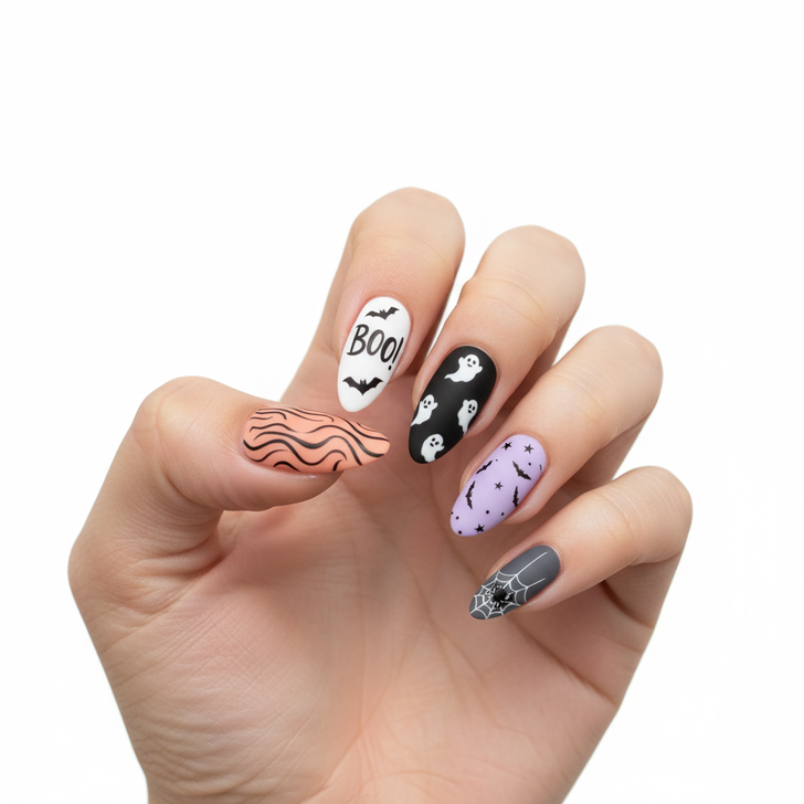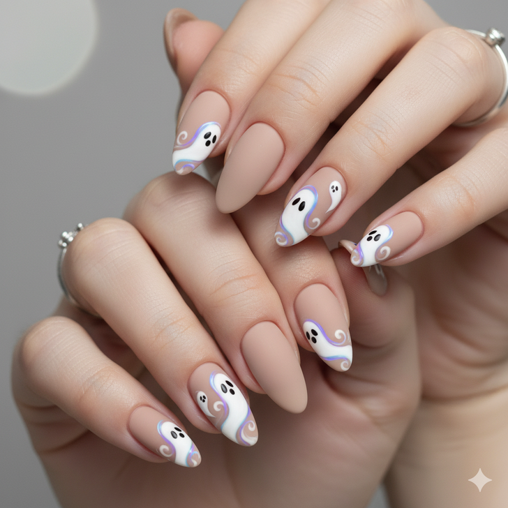 Pour ceux qui préfèrent leur Halloween avec une touche de mignonnerie, les ongles à thème fantôme sont un classique intemporel. Crée une base d’un blanc doux et laiteux. Puis, ajoute quelques fantômes qui regardent timidement du côté d’un ongle, l’un avec un petit “o” pour la bouche, exprimant la surprise, et une queue vaporeuse et amusante. C’est un look fantaisiste et délicieusement hanté.