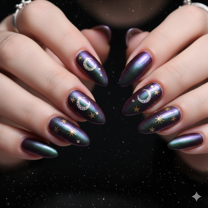 Commence par une base de noir charbon, vert forêt ou prune profond. Ensuite, ajoute une couche supérieure floconneuse qui passe du violet au bleu puis au vert, un paillettes holographiques dispersées, ou une poudre chromée gris acier. Cela transformera tes ongles en un portail céleste. Accentue tes ongles avec des phases de lune délicates et de petites étoiles.