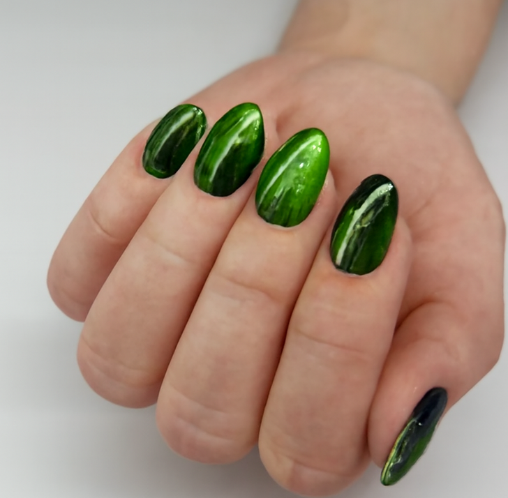 Ce kit vert velouté offre une apparence semblable à du slime. Le look brillant est appelé une manucure œil de chat. Un technicien en onglerie utilisera un vernis magnétique pour l’obtenir, en l’appliquant puis en utilisant un aimant pour faire tourbillonner les particules métalliques dans le vernis.