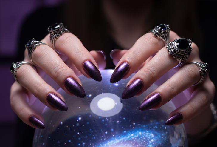 Le thème de la voyante est riche en détails. Pense aux profonds bordeaux, aux violets royaux et aux accents dorés. L’art des ongles peut comporter des éléments complexes tels que des symboles de l’œil de la providence (l’œil qui voit tout), des corps célestes (croissants et soleils), et des motifs mystiques délicats. Sinon, tu peux opter pour la simplicité avec un violet chromé et porter beaucoup de bagues pour parfaire le costume mystique.