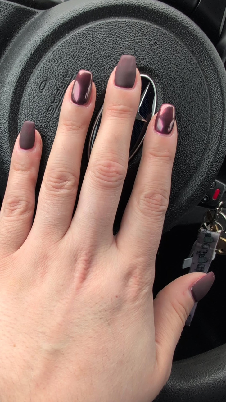 Pour celles qui cherchent un design profond, travaillé et stylé, sans pour autant recourir à des couleurs vives ou à des motifs complexes, la solution idéale réside dans le jeu des textures. Les experts recommandent d’alterner finition mate et brillante pour sublimer même la manucure classique la plus simple. L’association du mat et du brillant est une technique raffinée qui confère un aspect précieux à tes ongles. Pour ce type de manucure, les teintes sombres et intenses sont particulièrement recommandées. Pense au bordeaux, au bleu nuit, à l’émeraude, ou même au noir. Regarde comme c’est sublime !
