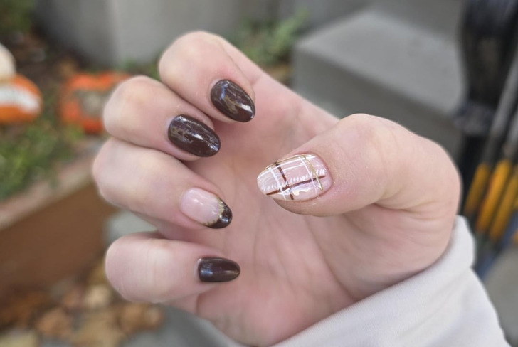 Le motif à carreaux est une trouvaille pour ceux qui recherchent un design strict mais pas ennuyeux. Il existe deux variantes : le tartan et le vichy. Le tartan se distingue par sa grande taille classique et ses combinaisons de couleurs telles que le rouge, le noir, le vert ou le bleu, le jaune, le noir. Tandis que le vichy est un petit carreau bicolore. Les experts du magazine de mode Byrdie conseillent de jeter un œil sur un carreau marron. Ils suggèrent d’essayer ce design sur une French manucure. Il est également possible de choisir un ongle d’accent. Les carreaux sont un éternel classique dans le textile et la mode, qui a toujours l’air cher et élégant. Un tel élément dans une manucure reflète ton attention aux détails et ton goût.