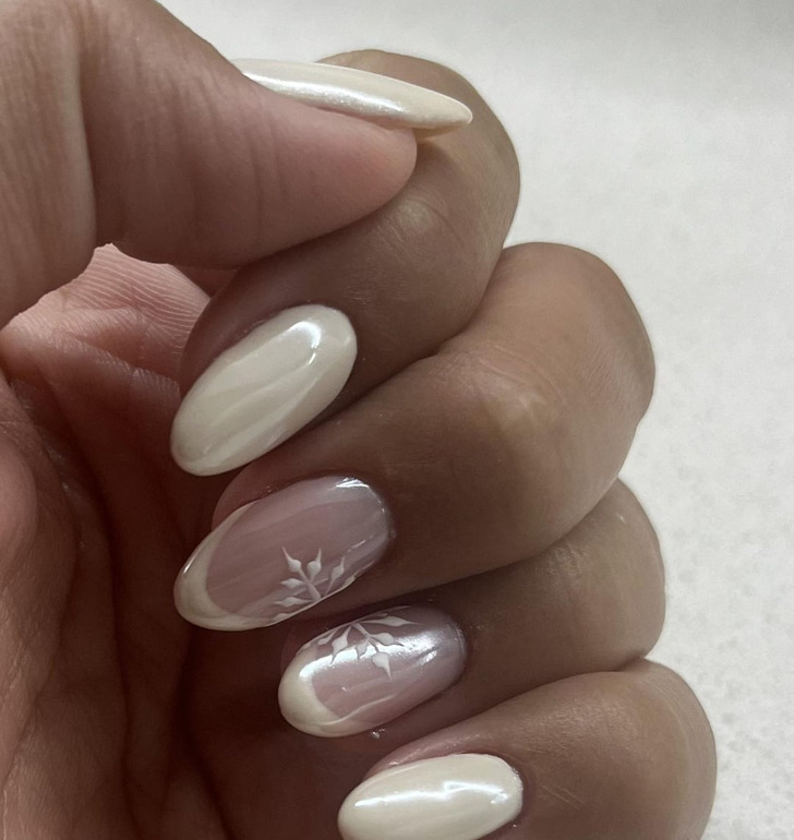 Si tu souhaites ajouter une touche de magie et de confort hivernaux à ton look tout en restant sobre, essaie la French manucure avec des flocons de neige. Cela donne un aspect incroyablement délicat. Une base nude ou rose laiteux garantit une apparence élégante et “haut de gamme”. Ce design adorable améliorera certes ton humeur et constituera le complément idéal, aussi bien pour un look quotidien que pour une tenue de soirée. L’essentiel est de ne pas exagérer avec le nombre de flocons de neige. Tu peux choisir un ongle en accent ou appliquer de minuscules flocons sur le bord de l’ongle. Pour un effet encore plus enchanteur, tu peux ajouter des paillettes ou un peu de scintillement.