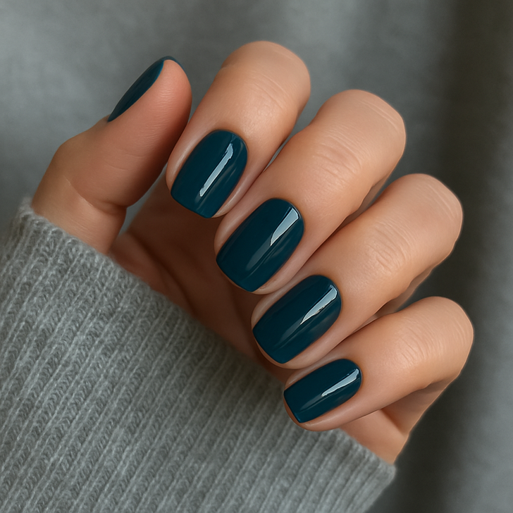 Un turquoise foncé intense se distingue, mais n’alourdit pas l’ensemble, ce qui en fait le meilleur choix pour une manucure chic et raffinée. Il se marie parfaitement avec des tons métalliques, des pastels doux, voire des motifs audacieux.