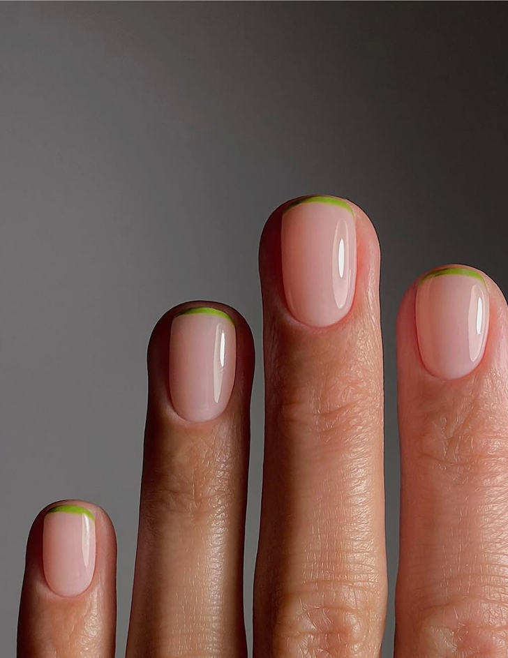 La micro-french est la nouvelle génération de la French classique que tout le monde connaît. Utilise des couleurs vert vif pour accentuer son effet. Ce design est particulièrement réussi sur des ongles courts de forme carrée.