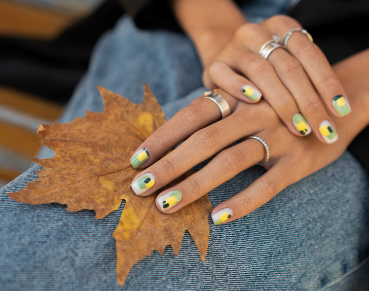 Chromé argenté et les nuances de vert terreux et moussant créent une association ultra-cool. La manucure se distingue et parait chère grâce à sa combinaison stylée et une abstraction colorée. Ce détail ajoutera une touche d’élégance automnale à ton look.