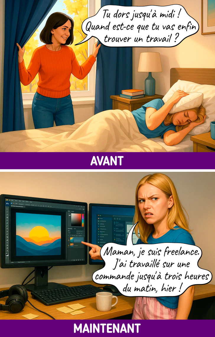 Pour la génération plus âgée, travailler signifie quitter la maison à 8 heures du matin et travailler jusqu’à 17 heures. Et pas autrement