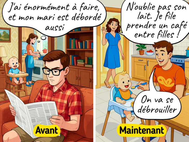Autrefois, l’éducation des enfants et la gestion du foyer étaient considérées comme des tâches féminines. Désormais, c’est une responsabilité partagée, et les papas s’occupent volontiers du bébé pour que maman puisse se reposer