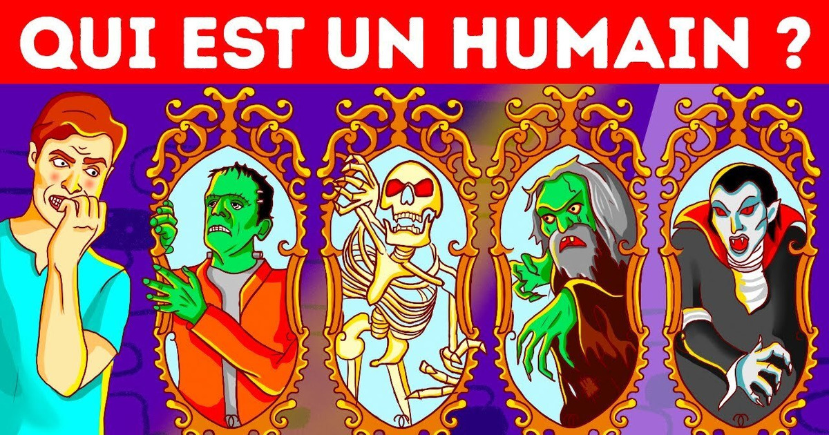 Ça a marché ! La porte s’ouvre, et tu t’engouffres à l’intérieur. Tu descends les escaliers et arrives dans un grand hall. Plusieurs torches s’allument, et tu aperçois 4 énormes miroirs. Ils reflètent Frankenstein, un squelette, un zombie et un vampire. L’une de ces créatures est un être humain. Peux-tu deviner de qui il s’agit ?