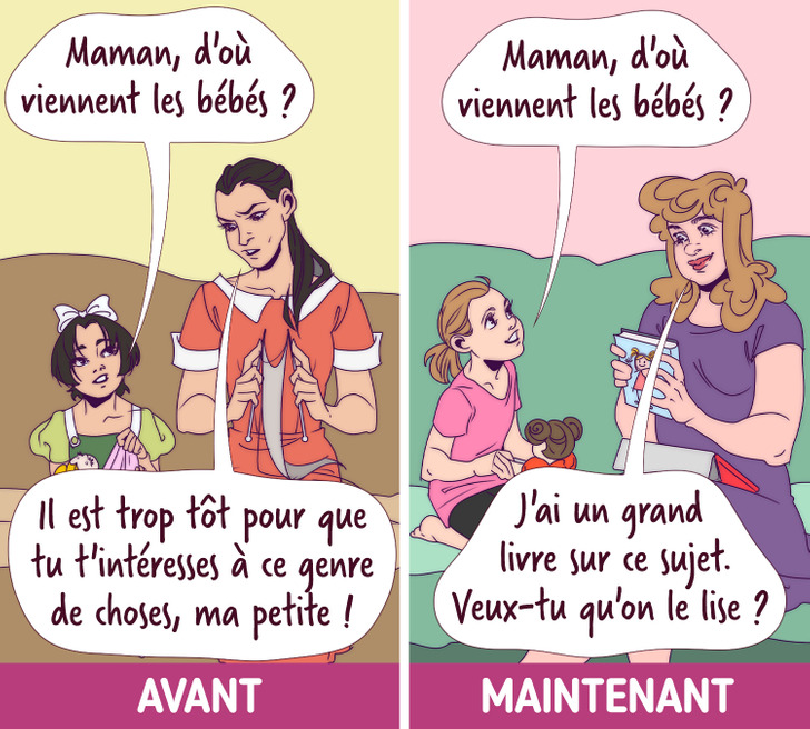 Autrefois, l’éducation sexuelle des enfants se passait sans l’intervention des parents : les enfants étaient éduqués par leurs aînés. Aujourd’hui, les parents n’hésitent plus à en parler.