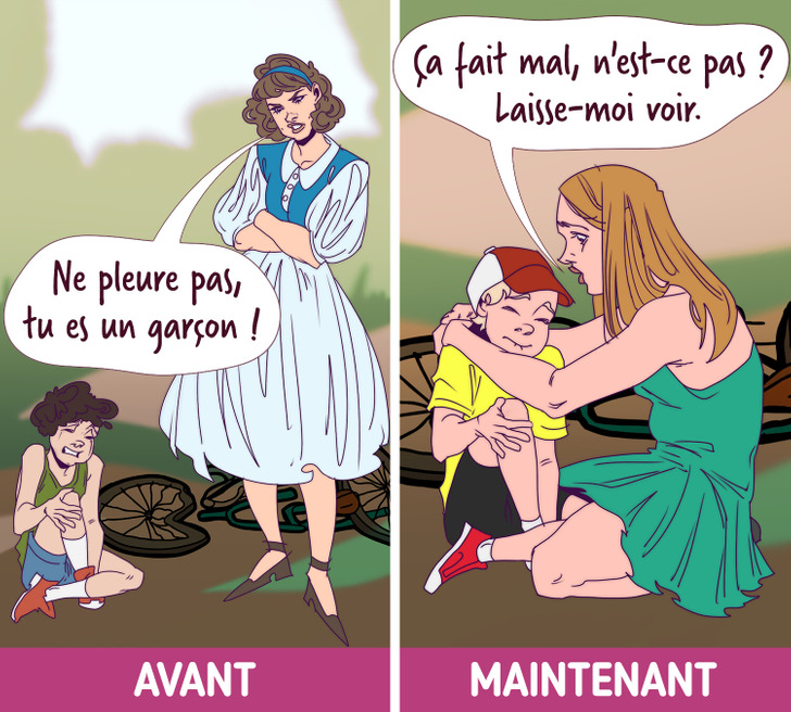 Les garçons n’avaient pas le droit de ressentir la peur, la douleur, parce qu’ils étaient de “futurs hommes”. Aujourd’hui, les parents permettent aux enfants d’exprimer leurs émotions, quel que soit leur sexe.
