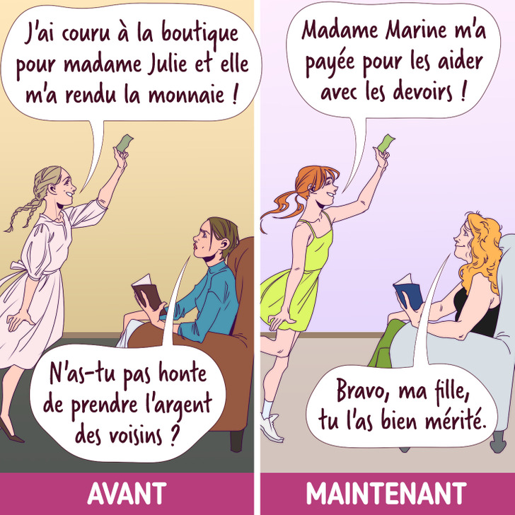 On nous a appris à aider tout le monde pour rien : à faire les devoirs avec les mauvais élèves, à s’occuper des enfants du voisin, etc. Aujourd’hui, il est devenu normal de valoriser son travail.