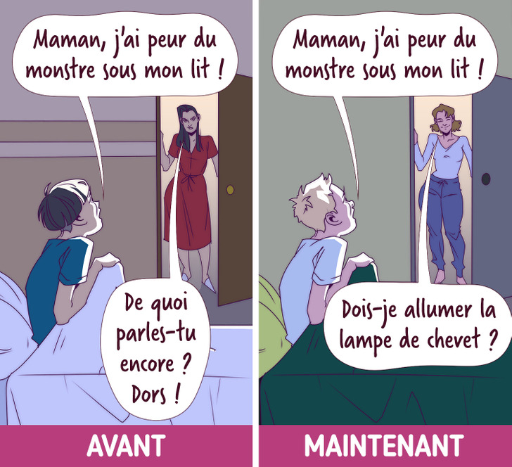Nos parents géraient les peurs des enfants en leur disant simplement qu’il n’y avait pas de monstres sous le lit et en éteignant la lumière. Nous essayons de ne pas dévaloriser les peurs des enfants et de les aider à s’en débarrasser.