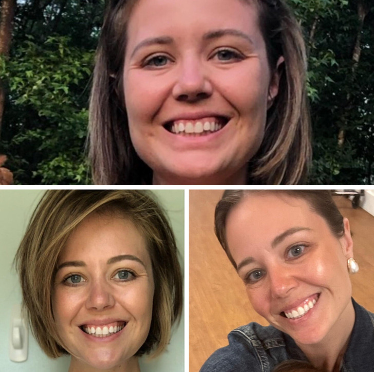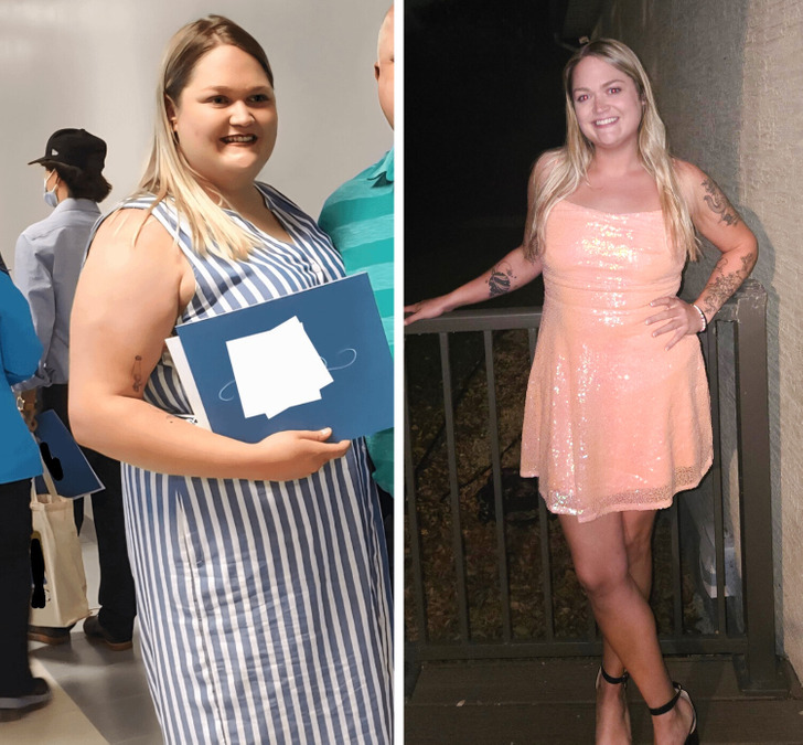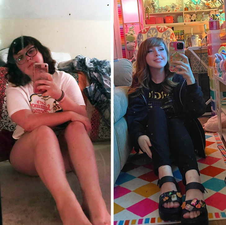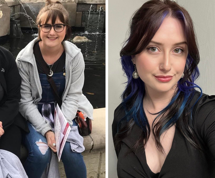 “Mon 18ème anniversaire au collège. Je me sentais mal à l’aise. La photo de droite a été prise cette année, et j’ai enfin confiance en moi”