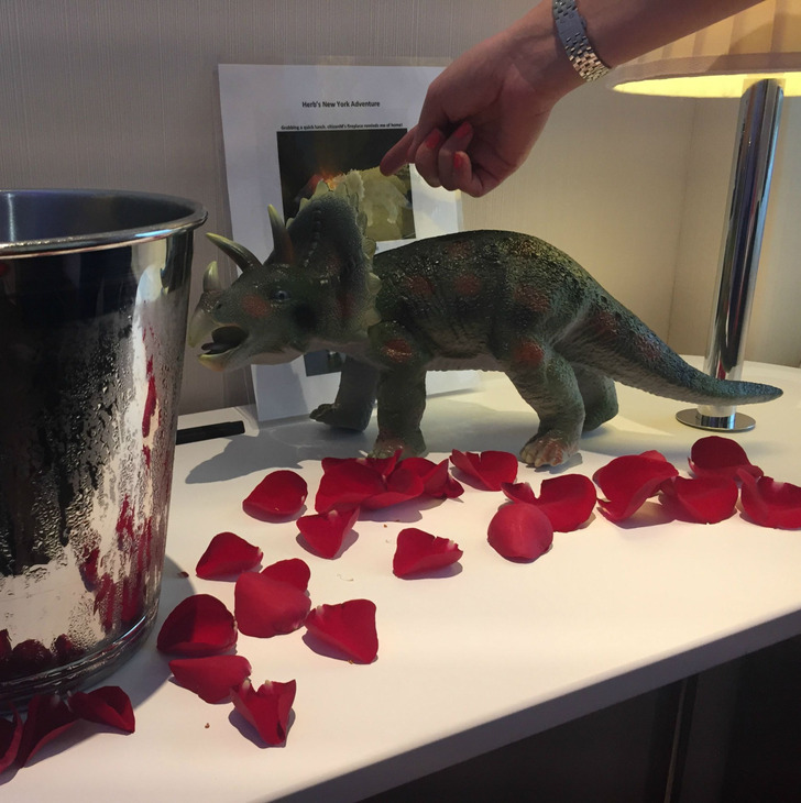 “Lors de la réservation, j’ai écrit dans la rubrique souhaits particuliers : ” Je veux un dessin de dinosaure “. Et puis je l’ai oublié. À la réception, l’administratrice a souri mystérieusement : ” J’espère que cela vous plaira “. Dans la chambre, cela m’attendait”