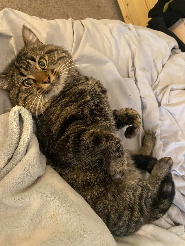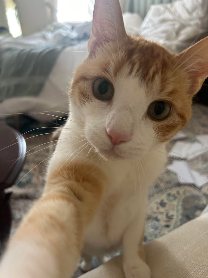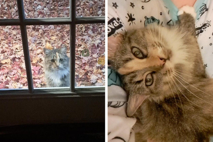 “Cela fait déjà quelques mois qu’il rôdait autour de la maison, mais c’est seulement aujourd’hui qu’il est venu de lui-même, miaulant, se frottant, demandant de l’attention. J’ai saisi l’occasion et je l’ai pris. Il fait froid dehors, et il est tout sale et maigre... mais maintenant il est enfin au chaud et il semble être incroyablement heureux.”