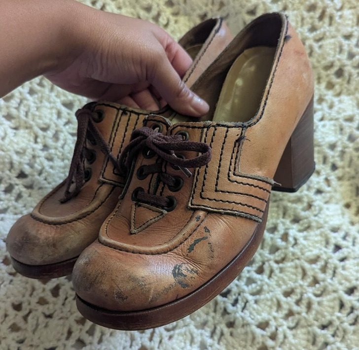 “J’ai trouvé dans une friperie des chaussures des années 70 incroyablement chouettes. On voit qu’elles ont déjà été portées, mais elles sont tout de même en très bon état”
