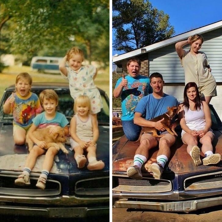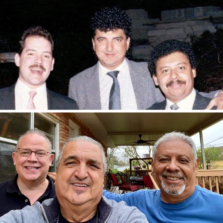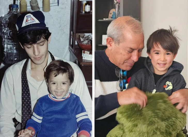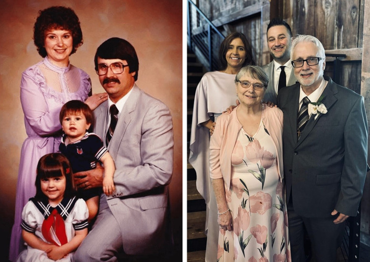 On dit qu’on ne se baigne jamais deux fois dans le même fleuve, mais les personnes de notre sélection y sont pourtant parvenues. Nous avons rassemblé 17 duos de photos entre lesquels des décennies se sont écoulées, les époques ont changé et les enfants ont grandi. Pourtant, le mari et l’épouse s’aiment toujours autant, les amis restent tout aussi fidèles, et la grand-mère chérie serre sa petite-fille dans ses bras plus fort que jamais. Chacun de ces visages a conservé cette même étincelle dans le regard et ce sourire sincère. Prépare-toi à une bonne dose de douce nostalgie.