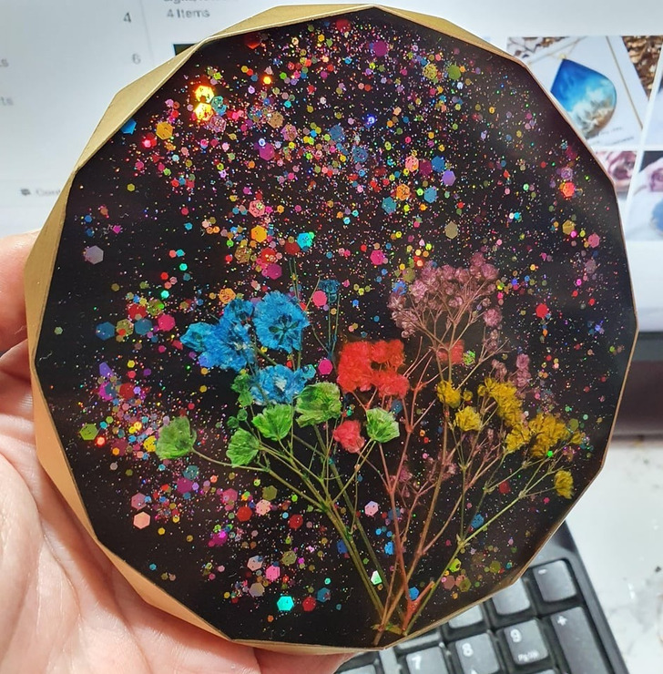 " Le dessous de tasse que j’ai fabriqué aujourd’hui. J’ai hâte d’ajouter la dernière couche de vernis pour faire ressortir l’éclat des fleurs "
