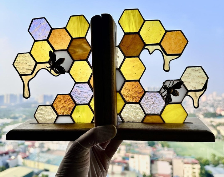 " Serre-livres en vitrail en forme de ruche que je viens de terminer "