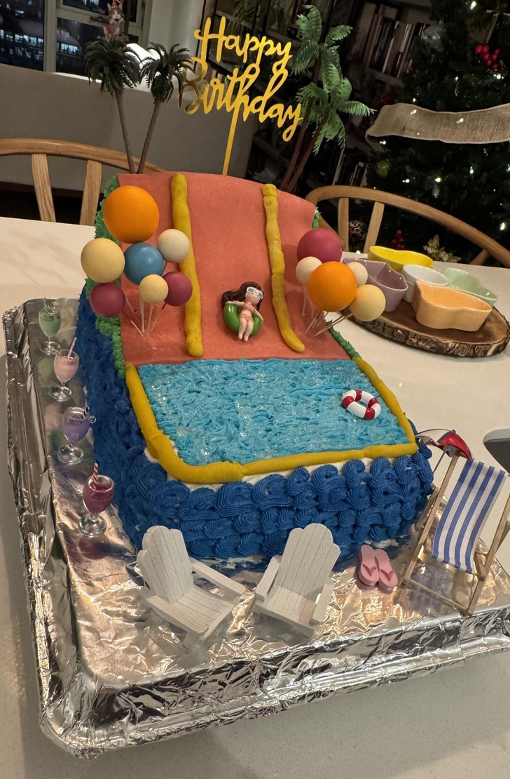 “Ma femme m’a demandé ce cadeau en plaisantant, mais je l’ai vraiment fabriqué. Ce n’est pas parfait, mais je suis fier de moi. C’est un gâteau en forme de toboggan aquatique”