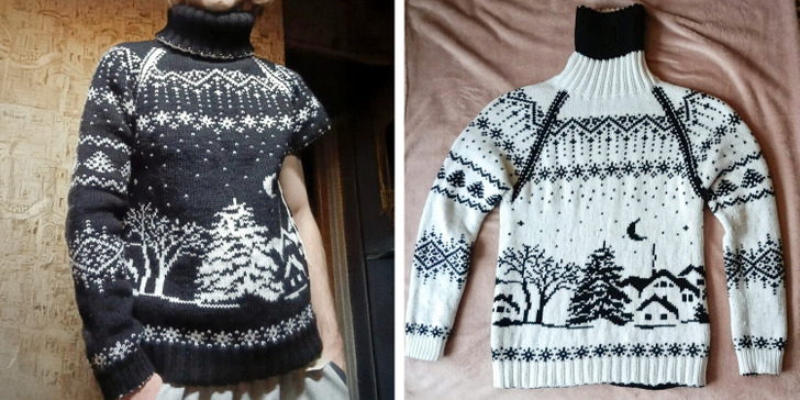 " Je me suis tricoté un pull réversible avec un paysage hivernal douillet. Le pull est doux, chaud, un tel que l’on ne peut acheter dans aucun magasin ! "
