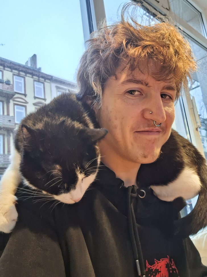 Je suis un habitué de ce café à chats et j’ai un nouveau foulard. Ce chat-là n’est presque jamais câlin, mais aujourd’hui, c’était son jour. Je me sens tellement honoré d’avoir gagné sa confiance au fil du temps