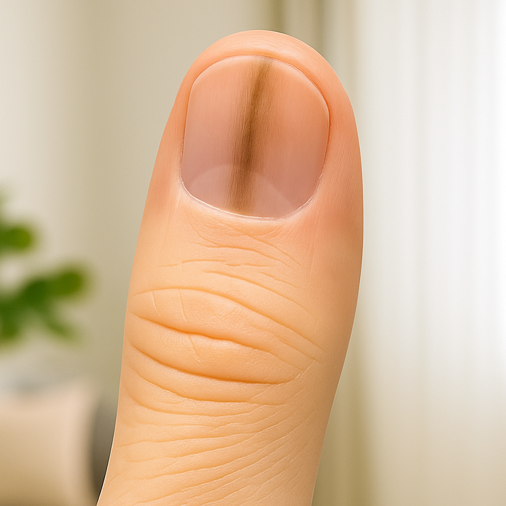 Si tu as déjà remarqué une ligne brun foncé ou noire courant le long de ton ongle de la base jusqu’à la pointe en te demandant “Est-ce que c’est normal ?”, cette strie s’appelle une mélanonychie. Elle apparaît généralement comme une bande verticale qui commence près de la matrice et s’étire jusqu’au bout de l’ongle, et elle peut toucher un seul ongle ou plusieurs. Chez les personnes à la peau naturellement plus foncée, ces lignes peuvent être totalement normales.