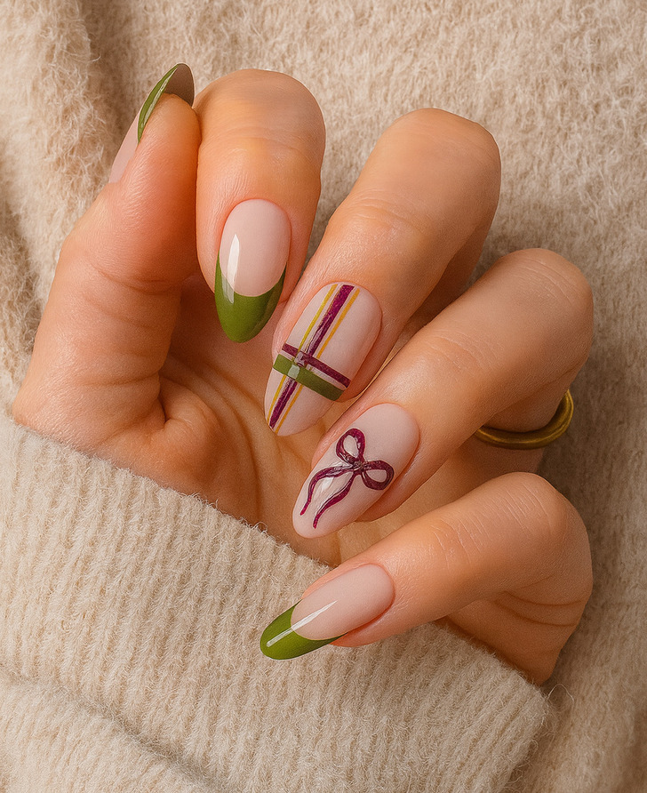Des volutes douces et fluides donnent vie à ces ongles, créant du mouvement et de l’élégance à chaque courbe. Les couleurs classiques de Noël — vert profond, rouge festif et touches d’or chaleureux — s’entrelacent en arcs lisses et brillants, à la fois ludiques et raffinés.
