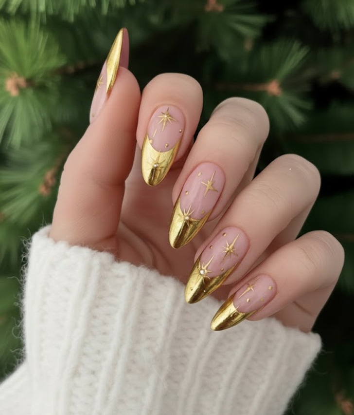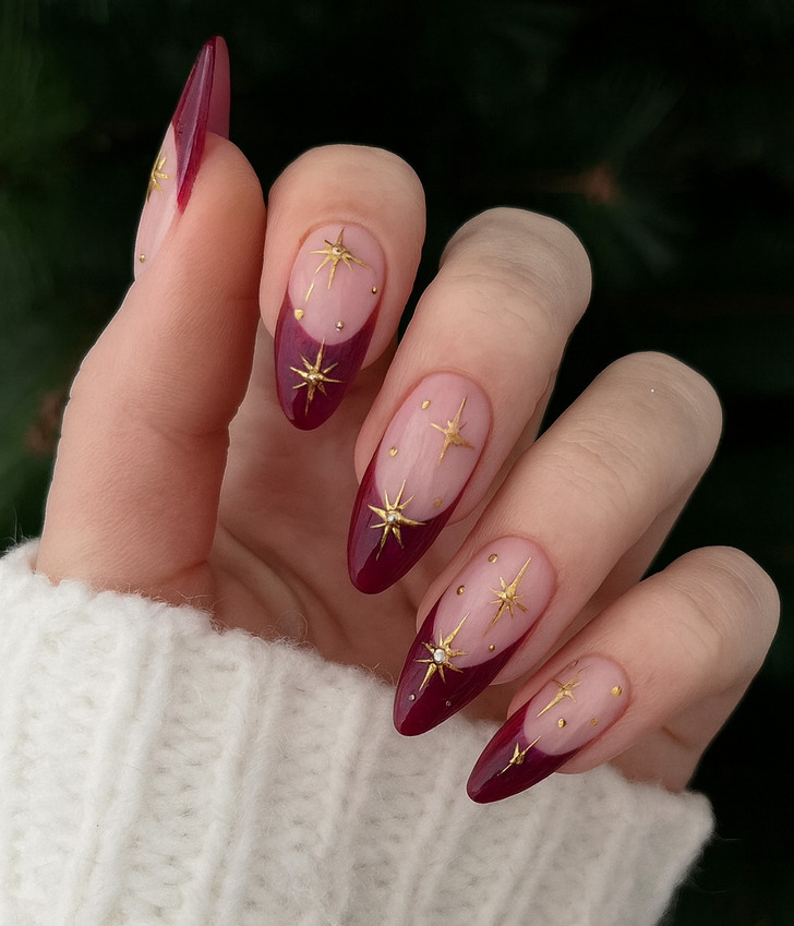 Au lieu d’un look totalement doré, il se dévoile à travers des accents délicats qui subliment le design. Imagine une french manucure bordeaux profond, rehaussée de détails célestes dorés, apportant de la profondeur, du contraste et une touche de luxe sans éclipser la manucure.