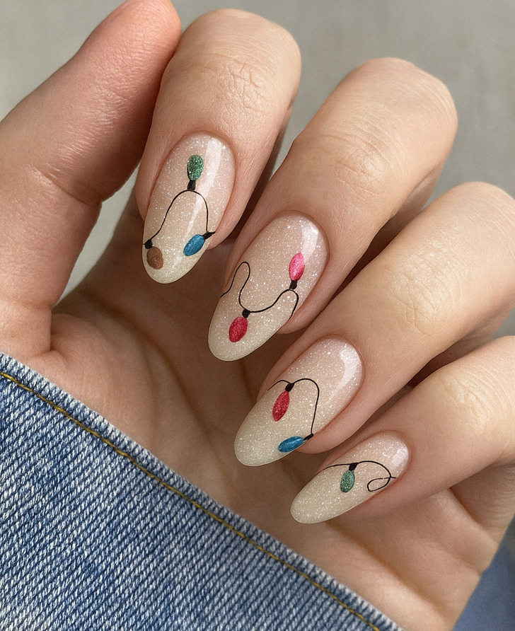 Un minuscule motif de guirlande lumineuse envahit l’inspiration manucure, apportant une touche ludique aux bases translucides et aux teintes neutres brillantes. C’est mignon sans être tape-à-l’œil, ultra photogénique et parfait si tu veux un nail art festif avec une finition minimaliste et clean girl.