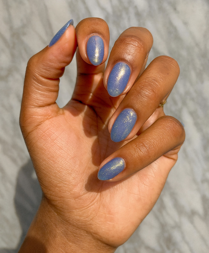 Le bleu givré capture la magie silencieuse de l’hiver, doux mais lumineux, comme la glace qui attrape la lumière du matin. Cette teinte bleu froid scintille d’un éclat subtil, offrant aux ongles une finition givrée et effet verre, à la fois pure, apaisante et élégante sans effort.