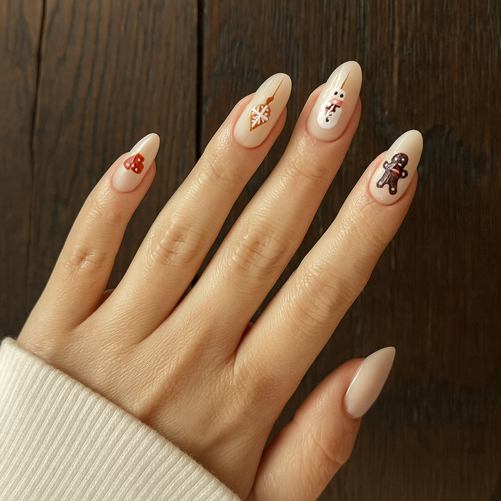 Les designs façon pâtisserie associent des tons neutres chaleureux à des lignes effet glaçage et à des motifs de biscuits ludiques pour un rendu doux et nostalgique, instantanément prêt pour Instagram — parfait si tu adoptes l’esthétique cozy-core et les manucures de fêtes aux teintes gourmandes.