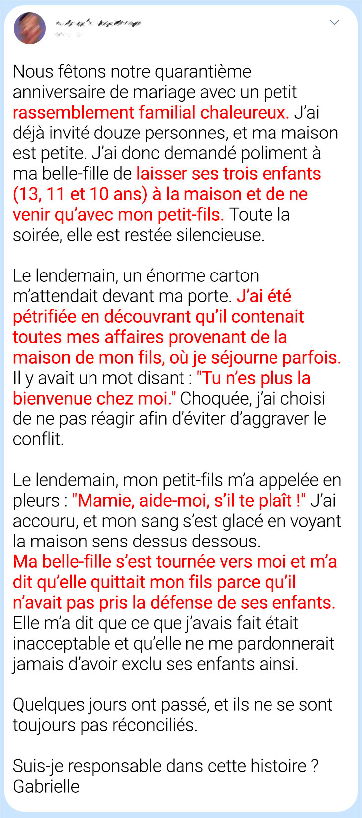 Les événements familiaux et les grandes étapes de la vie sont souvent des occasions de renforcer les liens, mais pour Gabrielle, son quarantième anniversaire de mariage a eu l’effet inverse. Désireuse d’accueillir tout le monde dans sa maison déjà bien remplie, Gabrielle a suggéré à sa belle-fille de ne venir qu’avec un seul enfant. Ce qu’elle voyait comme une solution raisonnable est vite devenu une source de conflit, menant à une grave brouille. Aujourd’hui, Gabrielle cherche des conseils pour réparer cette relation fragilisée. Voici son expérience.