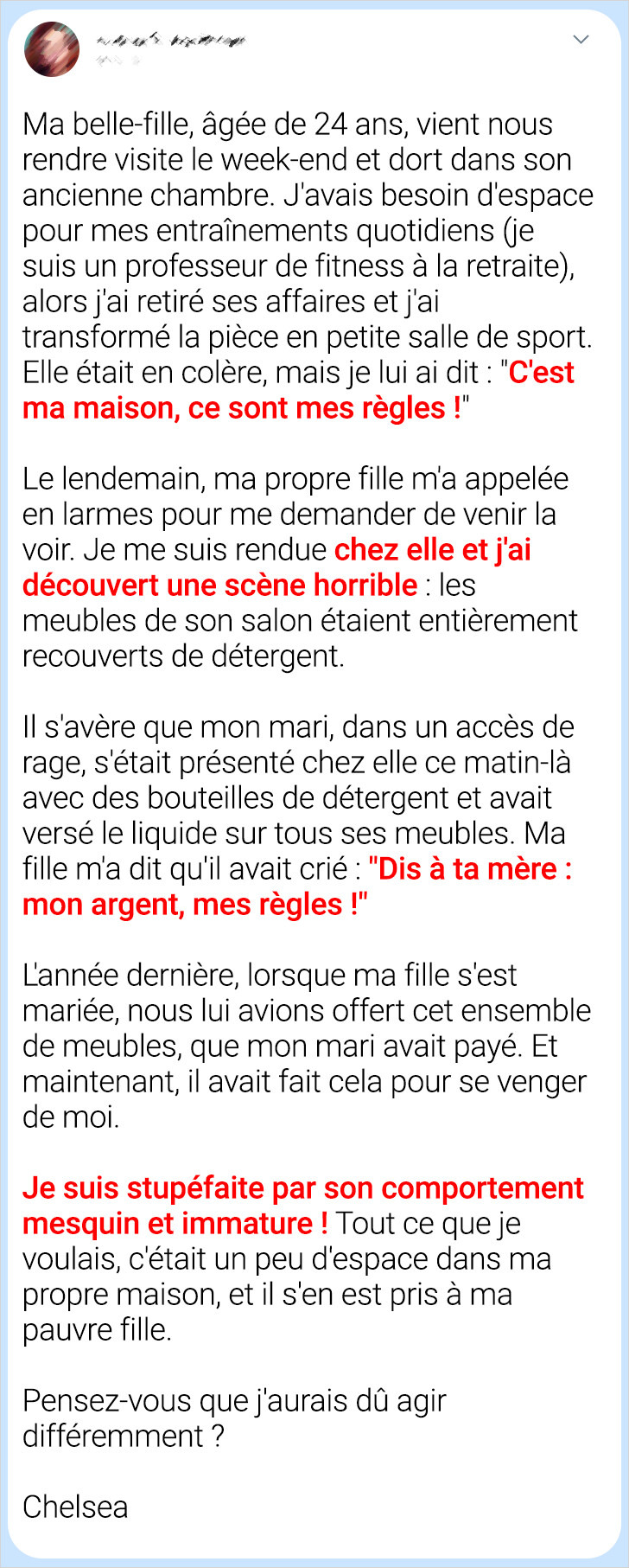Nous recherchons tous l’harmonie au sein de notre famille, mais les tensions peuvent s’intensifier, en particulier dans les familles recomposées où les parents et les beaux-enfants ont du mal à créer des liens. Dans le cas de Chelsea, elle a décidé de transformer la chambre de sa belle-fille de 24 ans en salle d’entraînement, une décision qui a provoqué une réaction inattendue et dramatique de la part de son mari. Frustrée et déconcertée, Chelsea a partagé son histoire dans l’espoir de trouver des conseils.