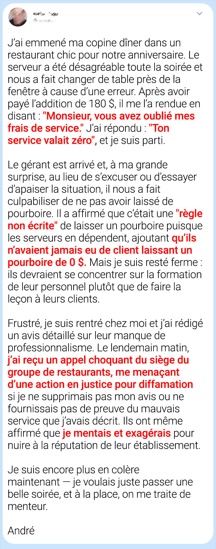 Les pourboires peuvent susciter de vifs débats, surtout quand le service n’est pas à la hauteur des attentes. André s’est récemment retrouvé au cœur d’une telle controverse après une mauvaise expérience dans un restaurant haut de gamme. Frustré par le comportement du serveur, il a décidé de ne rien laisser.