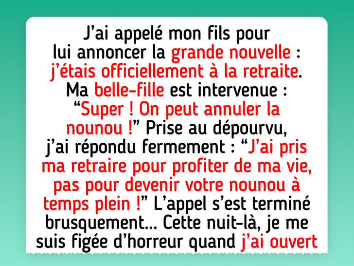 J’ai appelé mon fils pour partager la nouvelle excitante comme quoi j’étais désormais officiellement à la retraite. C’était un moment que j’avais attendu pendant des années — une chance de me détendre enfin, de voyager un peu, et enfin de consacrer du temps à mes propres intérêts. Avant même qu’il puisse répondre, ma belle-fille s’est exclamée avec empressement, “Super ! Maintenant, nous pouvons annuler la nounou !”