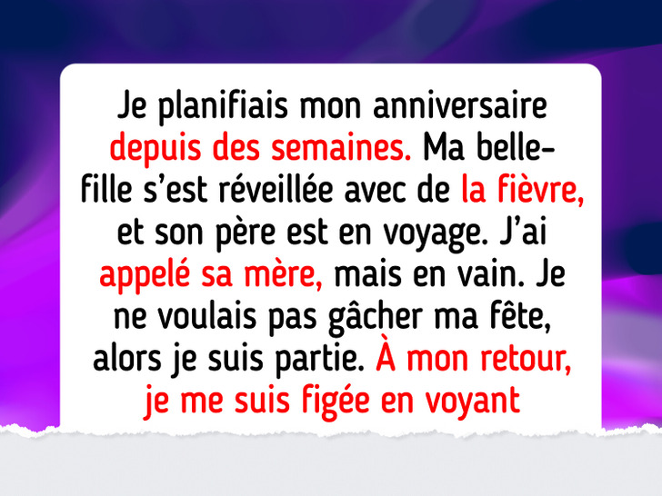 Après des années sans vraiment fêter mon anniversaire, j’ai enfin prévu quelque chose de sympa, mais tout a mal tourné. Mon mari est parti en voyage et ma belle-fille est tombée malade. J’ai réfléchi à ce que je devais faire, puis j’ai fini par choisir mon propre bonheur.
