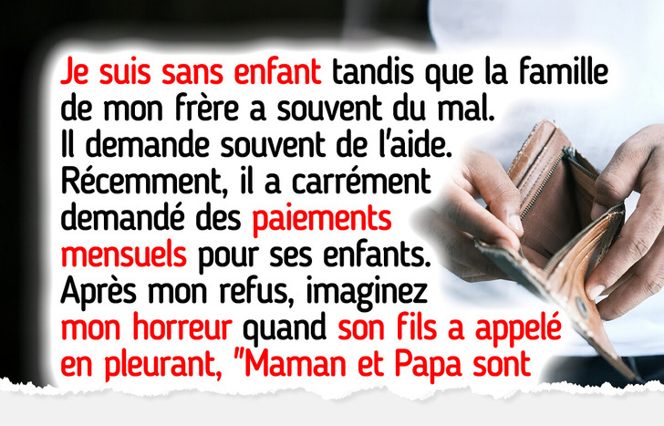 Jeanne n’a jamais voulu d’enfants et a plutôt construit une carrière qui lui offre une liberté financière. Son frère a choisi le chemin inverse : une famille grandissante, des factures constantes, et une lutte incessante pour suivre le rythme. Au fil des ans, il s’est appuyé plus d’une fois sur Jeanne pour obtenir de l’aide. Mais lorsque les “petites faveurs” se sont transformées en attentes bien plus importantes, la dynamique familiale a changé, et pas de la manière espérée.