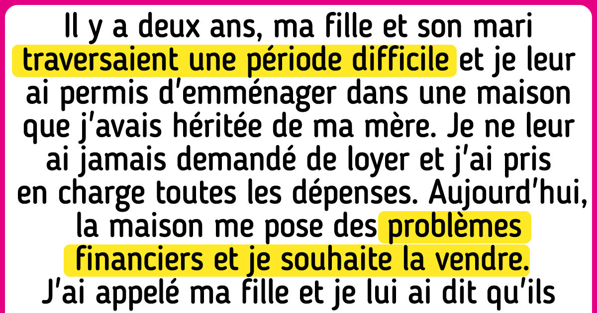 Il est normal que, même en couple et à l’âge adulte, nos parents nous aident et soient là pour nous si nous en avons besoin. Il est donc possible que, si nous avons des difficultés à payer un logement et qu’une maison familiale est disponible, ils nous laissent y rester jusqu’à ce que nous puissions nous remettre sur pied. Mais la question est de savoir combien de temps et ce qui leur arrive si le temps passe et que nous ne partons pas. L’histoire que nous te présentons ici répond à ces questions. Une mère a prêté une maison à sa fille et, des années plus tard, elle veut la récupérer. Ce qui l’a peut-être surprise, c’est la réponse de sa mère.