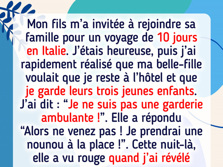 J’étais heureuse et excitée, mais j’ai vite compris que ma belle-fille voulait que je reste tout le temps à l’hôtel pour garder leurs 3 jeunes enfants, âgés de 7, 5 et 2 ans.